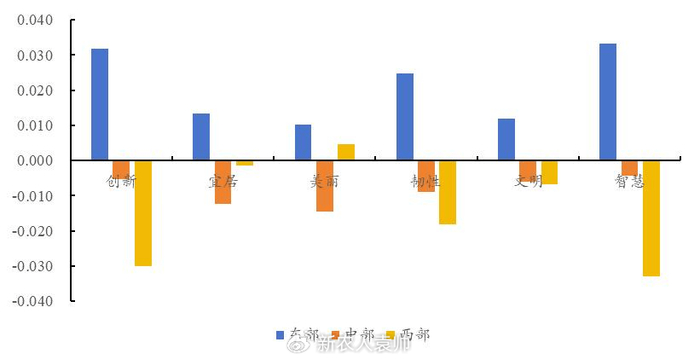 东部地区在创新、智慧和韧性三个维度显著高于全国均值,突出表现为科技引领、智慧化程度高、抗风险能力强的核心优势,宜居与文明维度领先幅度下降,美丽维度优势微弱;中部地区在各个维度上均低于全国平均水平,尤其在美丽、宜居和创新方面差距明显,反映出其面临生态环境建设、生活品质提升和创新能力培育的多重短板;西部地区呈现分化特征,其美丽表现优于全国平均,生态禀赋与环境优势凸显,宜居接近全国水平,但在创新与智慧两大关键动能上严重落后,韧性也明显不足,揭示出发展动能薄弱与系统抗风险能力偏低的深层挑战。