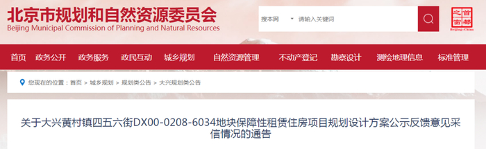 2024年11月14日至2024年11月22日,北京市规划和自然资源委员会大兴分局对大兴黄村镇四五六街DX00-0208-6034地块R2二类居住用地项目规划设计方案进行了为期7个工作日的现场及网上公示,公示期间共收到1条反馈意见。我分局组织实施主体对反馈意见进行整理研究,现将有关采信情况通告如下: