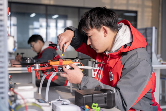 万通汽车学校学生在无人机实训课堂进行实操。万通汽车教育供图