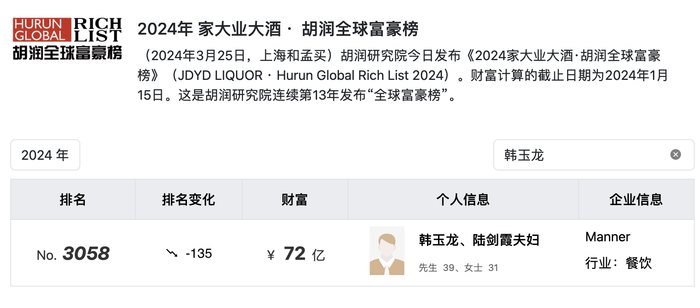 与此同时,Manner创始人韩玉龙、陆剑霞夫妇的财富也在迅速膨胀。2024年,Manner咖啡创始人39岁的韩玉龙和31岁的陆剑霞夫妇以72亿元身家排在《2024胡润全球富豪榜》榜单第3058位。