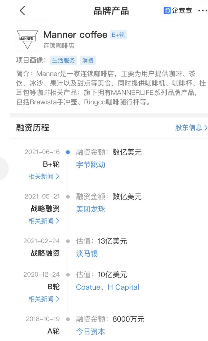 值得一提的是,从2018年开始,Manner先后拿到今日资本、H Capital、淡马锡、美团龙珠与字节跳动的投资。