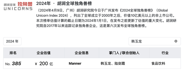 据《2024年胡润全球独角兽榜》,Manner以200亿元的估值排在榜单第385位。