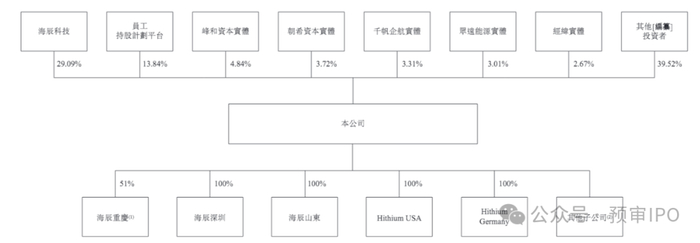 截至递交招股书前,海辰储能由海辰科技持股29.09%,由员工持股平台合计持股13.84%,由峰和资本实体持股4.84%,由朝希资本实体持股3.72%,由千帆企航实体持股3.31%,由众远能源实体持股3.01%,由经纬实体持股2.67%,由其他投资者合计持股39.52%。