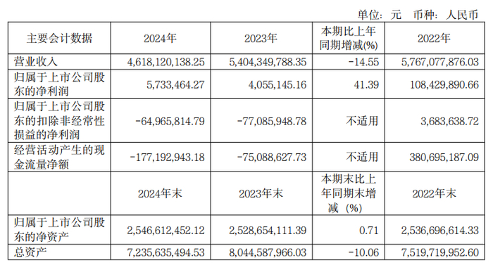报告显示,公司2024年营业收入为46.18亿元,同比下降14.55%;归母净利润为573.35万元,同比增长41.39%;扣非归母净利润为-6496.58万元,同比增长15.72%;基本每股收益0.01元。