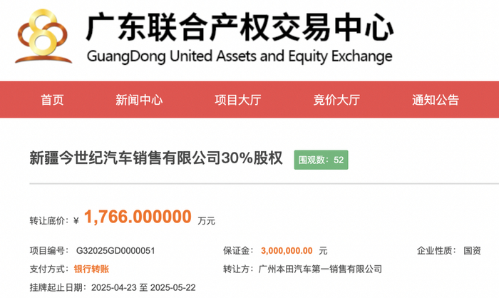 瑞财经 刘治颖 4月23日,广州本田汽车第一销售有限公司挂牌转让新疆今世纪汽车销售有限公司30%股权,转让底价为1766万元,披露结束日期为2025-05-22。