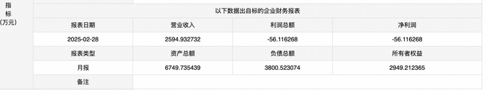 据2025-02-28财务报表显示,标的企业营业收入2594.93万元,净利润-56.12万元,资产总额6749.74万元,负债总额3800.52万元。