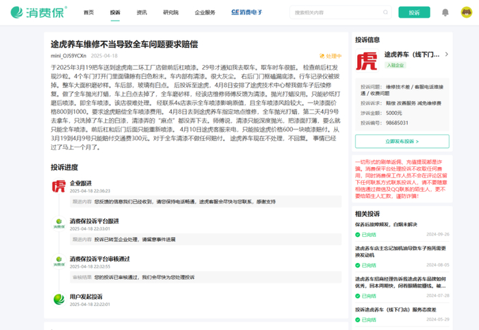 某用户于2025年4月18日向消费保投诉称,“于2025年3月19日把车送到途虎工厂店做前后杠喷漆,取车时车很脏,车内部有清漆,右后门门框磕漏底漆,行车记录仪被拔掉,整车大面积磨砂样......”
