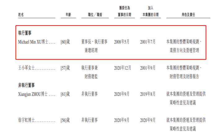 Michael MinXU博士(徐敏),60岁,美国国籍。目前任公司董事长、执行董事兼公司总经理,主要负责集团的整体策略规划、业务方向及运营管理。
