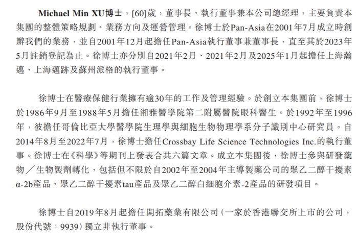 徐博士于Pan-Asia在2001年7月成立时创办其业务,并自2001年12月起担任Pan-Asia执行董事兼董事长,直至其于2023年5月注销登记为止。徐博士亦分别自2021年2月及2021年2月起担任上海瀚迈及上海迈迹的执行董事。