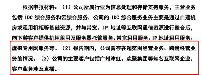 报告期内,公司曾存在超范围经营业务、跨境经营业务的情况。公司的主要客户包括广州津虹、欢聚集团等知名互联网企业,客户业务涉及直播。