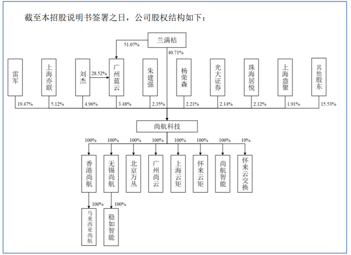 尚航科技的前身为尚航有限,成立于2010年7月,初始注册资金350万元,由兰满桔、雷军及广州菁英分别持有28.57%、57.15%及14.28%。其中,股东雷军正是小米的创始人,现为小米集团董事长兼首席执行官。