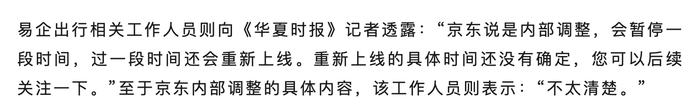 不过,目前“打车”入口已关闭。据媒体引述易企出行相关工作人员的说法,京东说是内部调整,会暂停一段时间,过一段时间还会重新上线。