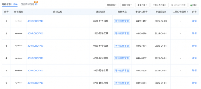5月6日消息,据天眼查,京东集团旗下北京京东叁佰陆拾度电子商务有限公司(以下简称“京东叁佰陆拾度电子商务”)于近日申请注册多个“Joyrobotaxi”商标,国际分类包括广告销售、科学仪器、运输工具、运输贮藏等,当前商标状态均为等待实质审查。