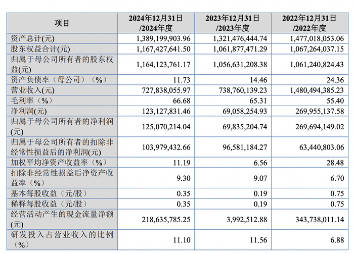 业绩方面,2022年至2024年,康华股份营业收入14.8亿元、7.39亿元、7.28亿元,归母净利润分别为2.7亿元、6983.52万元、1.25亿元,毛利率分别为55.4%、65.31%、66.68%。