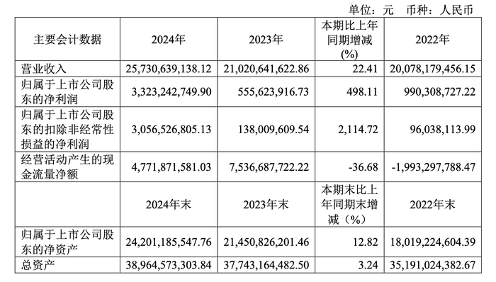 业绩方面,2024年,公司实现营收为257.31亿元,同比增长22.41%;归母净利润为33.23亿元,同比增长498.11%。