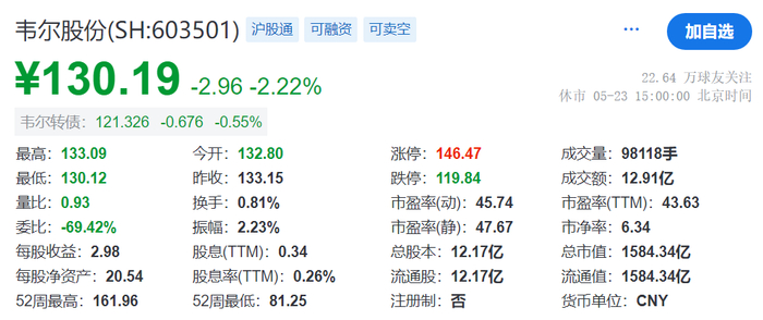 据悉,韦尔股份于2017年5月4日在深交所上市,截至5月23日收盘,韦尔股份每股报130.19元,总市值约1584.34亿元。