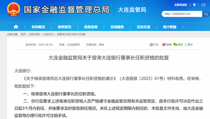 另悉,从2024年7月开始,曾涛就已经出任大连银行党委书记,为党内一把手,并于近期正式获批为职务一把手,即董事长一职,从而开启全面掌舵。
