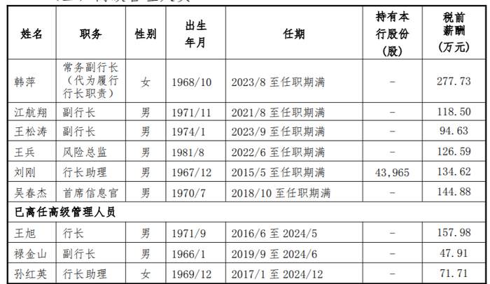 值得注意的是,原行长王旭在2024年6月因工作调整辞去对应职务。王旭辞任后,常务副行长韩萍代为履行行长职责,并于2025年2月获批担任副董事长的一职。