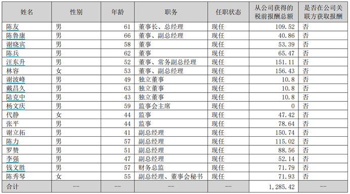 陈友、陈兵、陈鲁康、杨文庆、谢晓宾五人,去年的薪酬分别为109.52万元、65.47万元、40.86万元、0、53.39万元。多年来,作为公司的监事会主席,近日宣布减持的主角杨文庆,并未在公司领取薪酬。