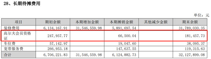 值得注意的是,在天源迪科的长期待摊费用中,存在着一项高尔夫会员资格证费,这项费用在去年期初为24.8万元,期末余额为18.15万元。