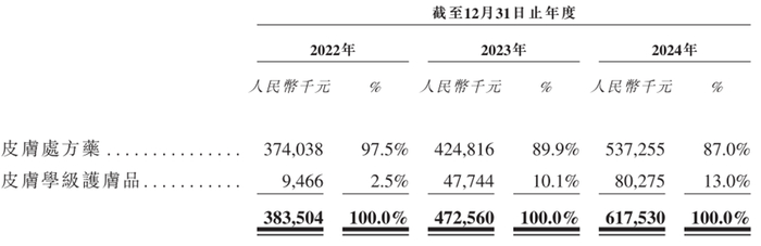 2022年-2024年,德镁医药的收入分别为3.84亿元、4.73亿元及6.18亿元,收入主要来自于皮肤处方药,各期业务收入占比总收入的97.5%、89.9%、87%,剩余收入来自皮肤学级护肤品,该业务的收入占比在逐年提升。