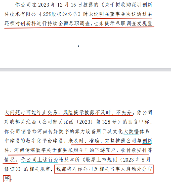 2024年3月29日,深交所第三次向安奈儿发出关注函,指出其未在首次披露《收购公告》时说明在董事会决议通过后还需对创新科技进行全面尽职调查,也未揭示尽职调查发现重大问题时可能终止交易的风险。