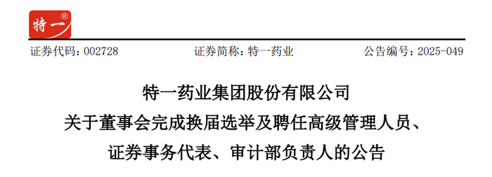 据特一药业7月16日换届公告,许丹青因任期届满不再担任公司董事长、非独立董事、董事会战略委员会主任委员及总经理职务;许松青不再担任公司副董事长、非独立董事、董事会战略委员会委员及副总经理职务。许荣煌接任许丹青公司董事长、总经理、法定代表人及非独立董事职务;许荣峻新任特一药业副总经理;许紫兰新任特一药业董事会秘书。