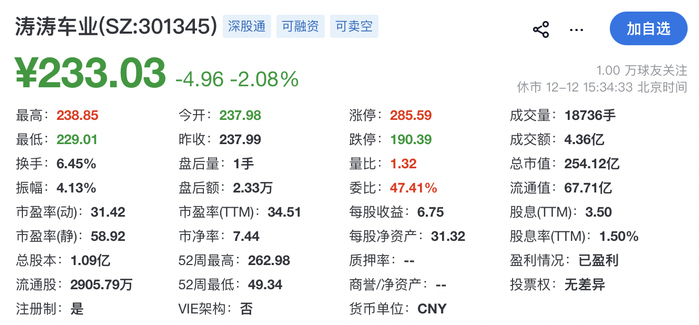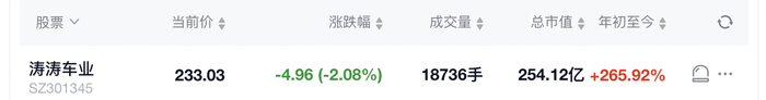 截至发稿时,涛涛车业A股报233.03元,总市值约254.12亿元。自年初至今,其股价累计上涨265.92%。