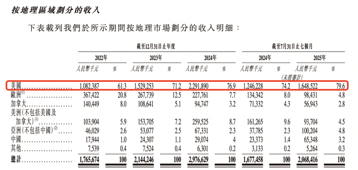 值得一提的是,根据弗若斯特沙利文的资料,涛涛车业是中国电动出行行业“出海”的领军企业。于2024年,公司超99%的收入源自海外市场,美国为最大出口目的地。其中,2024年76.9%收入来自美国,到了2025年前7个月,该比例上升至79.6%。