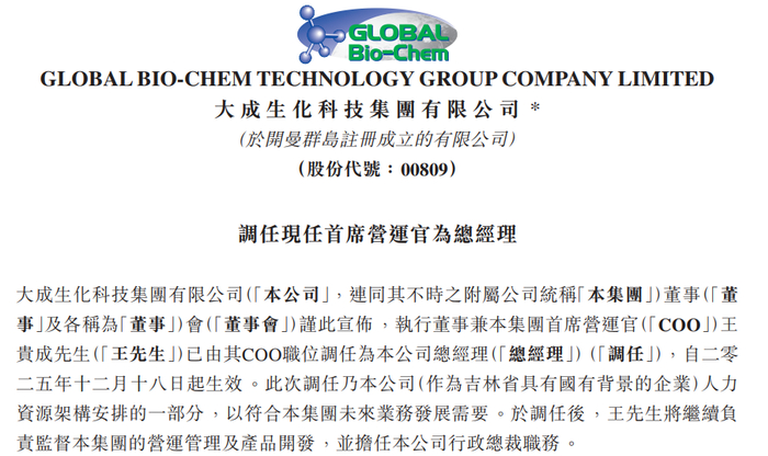 公告显示,大成生化科技集团有限公司执行董事兼集团首席营运官王贵成于2025年12月18日起,由首席营运官职位调任为公司总经理。此次调任是公司(作为吉林省具有国有背景的企业)人力资源架构安排的一部分,以符合集团未来业务发展需要。