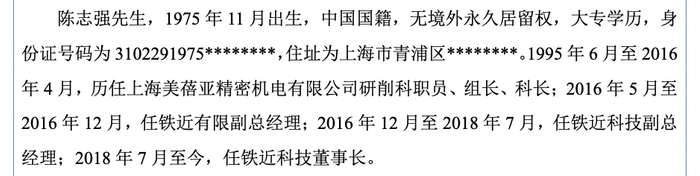 资料显示,陈志强,1975年11月出生,中国国籍,无境外永久居留权,大专学历。1995年6月至2016年4月,历任上海美蓓亚精密机电有限公司研削科职员、组长、科长;2016年5月至2016年12月,任铁近有限副总经理;2016年12月至2018年7月,任铁近科技副总经理;2018年7月至今,任铁近科技董事长。