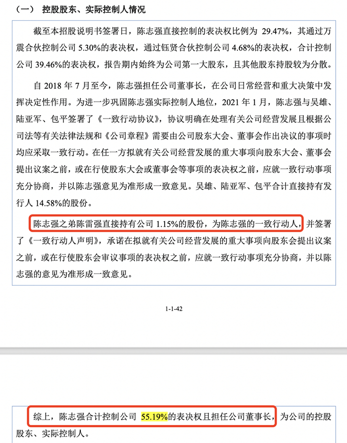 陈志强之弟陈雷强直接持有公司1.15%的股份,为陈志强的一致行动人,并签署了《一致行动人声明》,承诺在拟就有关公司经营发展的重大事项向股东会提出议案之前,或在行使股东会审议事项的表决权之前,应就一致行动事项充分协商,并以陈志强的意见为准形成一致意见。