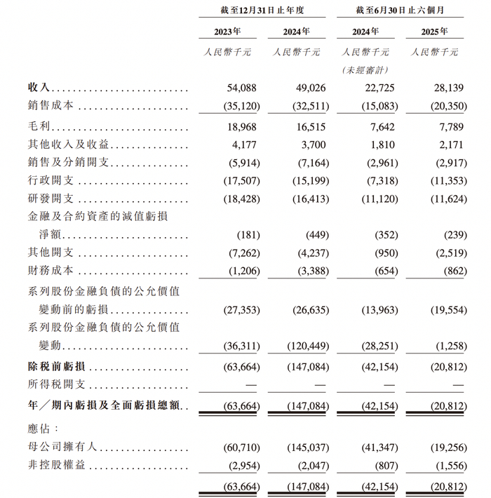 2023年、2024年及2025年上半年,新济医药收入分别为5408.8万元、4902.6万元、2813.9万元,研发开支分别为1842.8万元、1641.3万元、1162.4万元,年╱期内亏损及全面亏损总额分别为6366.4万元、1.47亿元、2081.2万元。