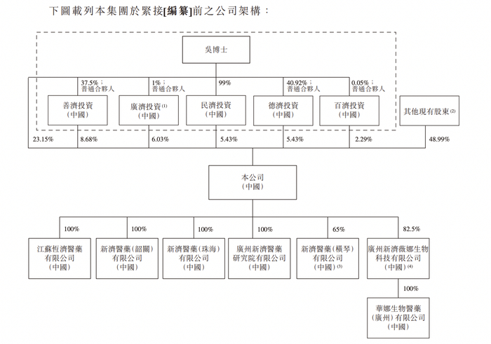 截至递表前,新济医药的创办人吴传斌持有约23.15%的股份,并因吴传斌担任多家实体的普通合伙人而被视为持有约22.43%的股份。吴传斌及其配偶潘昕亦透过一家由他们拥有的公司而持有约5.43%的股份。吴传斌、其配偶潘昕及吴传斌作为普通合伙人或由他们控制的实体被推定为持有合共约51.01%的股份,而他们构成公司的控股股东集团。
