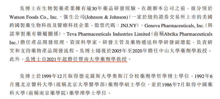 诺华制药有联属关系)、TevaPharmaceuticals Industries Limited(前称AbrikaPharmaceuticalsInc.)担任产品开发经理、资深科学家、研发主管及药物递送科学研发副总监,负责研究和支持药物产品开发流程。吴传斌随后于2005年至2020年担任中山大学药剂学教授。此外,吴传斌自2021年起担任暨南大学药剂学教授。