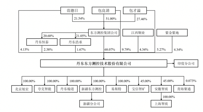IPO前,东方测控实际控制人为包良清、包才溢父子,包良清直接持有公司9.79%的股份,包才溢直接持有公司5.27%股份。包良清、包才溢通过控制东方测控集团公司及丹东恒泰、丹东浩承间接控制公司72.12%的股份表决权,合计控制公司87.18%的股份表决权。