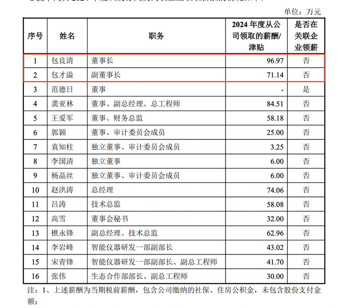 薪酬方面,2024年度,包良清包才溢从公司领取的薪酬/津贴分别为96.97万元、71.14万元。