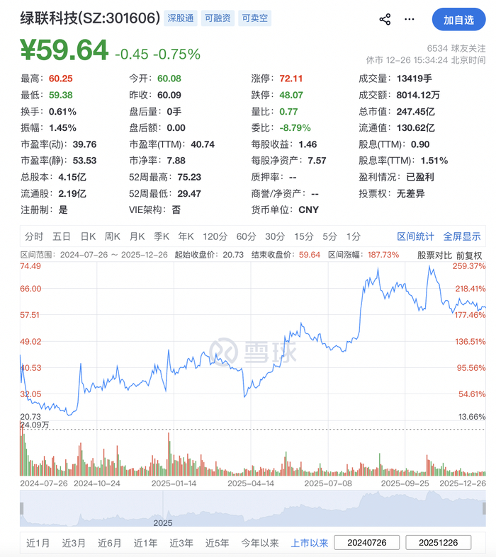 绿联科技于2024年7月26日在深交所创业板上市。截至2025年12月26日收盘,绿联科技报59.64元,总市值247.45亿元。自上市以来,公司区间涨幅为187.73%。