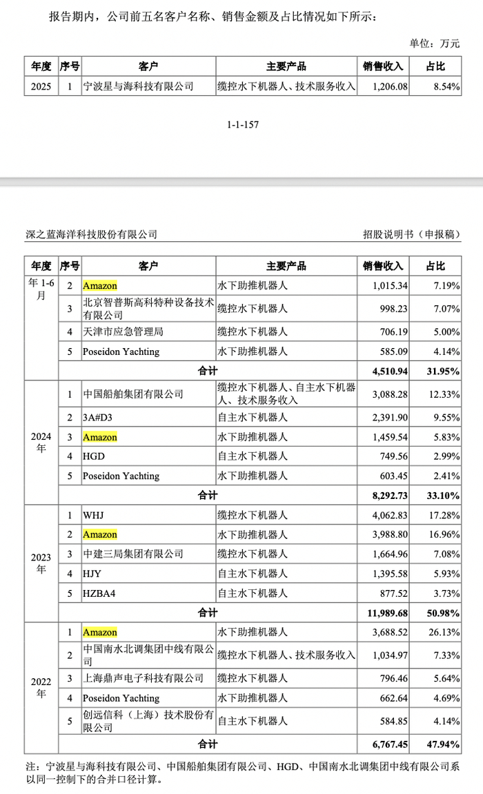 值得注意的是,2022年-2024年及2025上半年,深之蓝来自五大客户的销售收入分别为6767万元、1.2亿元、8292.73万元、4510.94万元,占比分别为47.94%、50.98%、33.1%、31.95%。