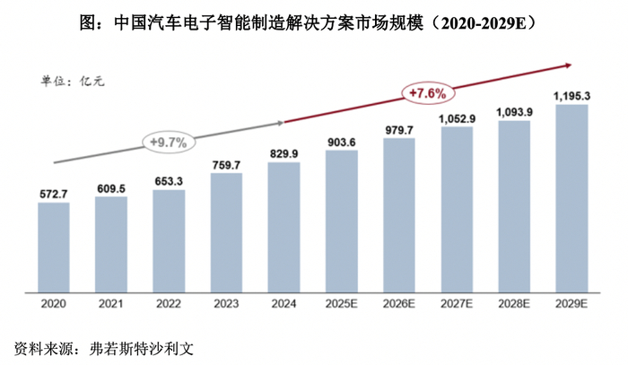 而中国汽车电子智能制造解决方案市场在过去几年保持了稳健增长,体现出新能源汽车、智能驾驶快速发展对上游制造装备与整线交付的强劲需求。2020-2024年,市场规模从572.7亿元增长至829.9亿元,年均复合增长率达9.7%。2025-2029年,市场总量预计将继续扩张,市场规模在2029年预计达到1,195.3亿元,对应年均复合增长率7.6%。