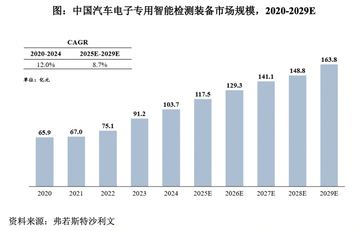 随着汽车“新四化”转型持续深化,中国汽车电子智能检测装备市场规模持续扩大,创造了传统燃油车时代所不存在的新增市场。2020-2024年,中国汽车电子专用智能检测装备市场规模由65.9亿元增长至103.7亿元,年复合增长率为12.0%。未来五年,中国汽车电子专用智能检测装备市场预计将实现8.7%的年均复合增长率,2029年市场规模将达到163.8亿元。