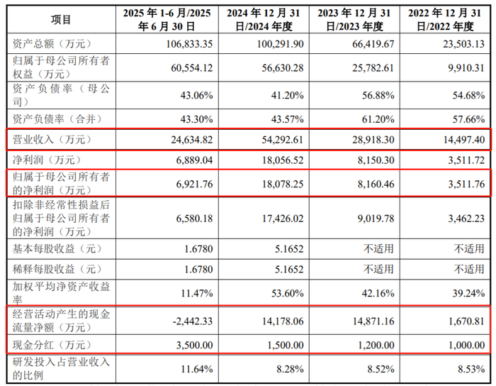 业绩方面,2022年至2024年及2025年上半年,猎奇智能营业收入分别为1.45亿元、2.89亿元、5.43亿元和2.46亿元,归属于母公司所有者的净利润分别为3511.76万元、8160.46万元、1.81亿元和6921.76万元。