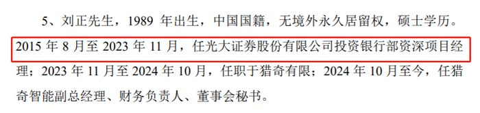刘正,1989年出生,中国国籍,无境外永久居留权,硕士学历。2015年8月至2023年11月,任光大证券股份有限公司投资银行部资深项目经理;2023年11月至2024年10月,任职于猎奇有限;2024年10月至今,任猎奇智能副总经理、财务负责人、董事会秘书。