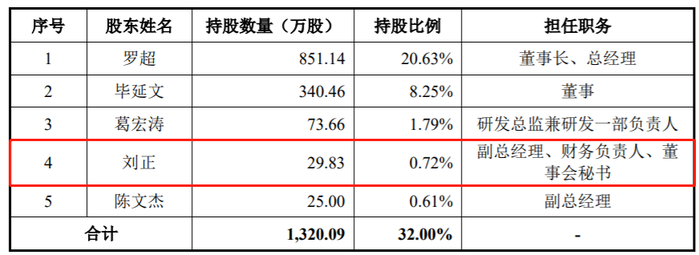 目前,刘正直接持有公司0.72%股份,同时身兼三职,任公司副总经理、财务负责人、董事会秘书。