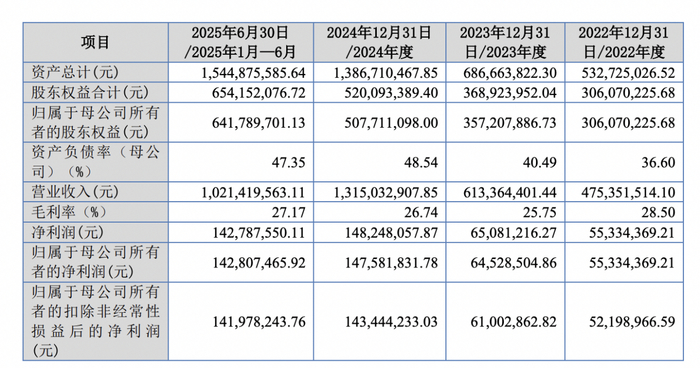 2022年至2024年及2025年上半年,蘅东光营业收入分别为4.75亿元、6.13亿元、13.15亿元及10.21亿元,归属于母公司所有者的净利润分别为0.55亿元、0.61亿元、1.43亿元及1.42亿元。