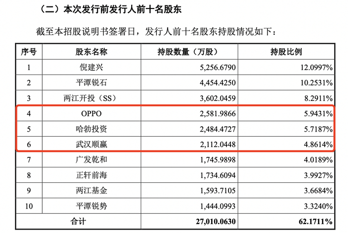 本次IPO前,OPPO、哈勃投资、武汉顺赢位列公司前十名股东,持股分别为5.94%、5.72%、4.86%。