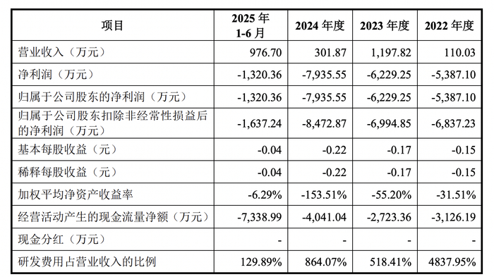 2022年-2024年及2025年上半年,新通药物营收分别为110.03万元、1197.82万元、301.87万元及976.7万元,净亏损分别为5387.10万元、6229.25万元、7935.55万元、1320.36万元。