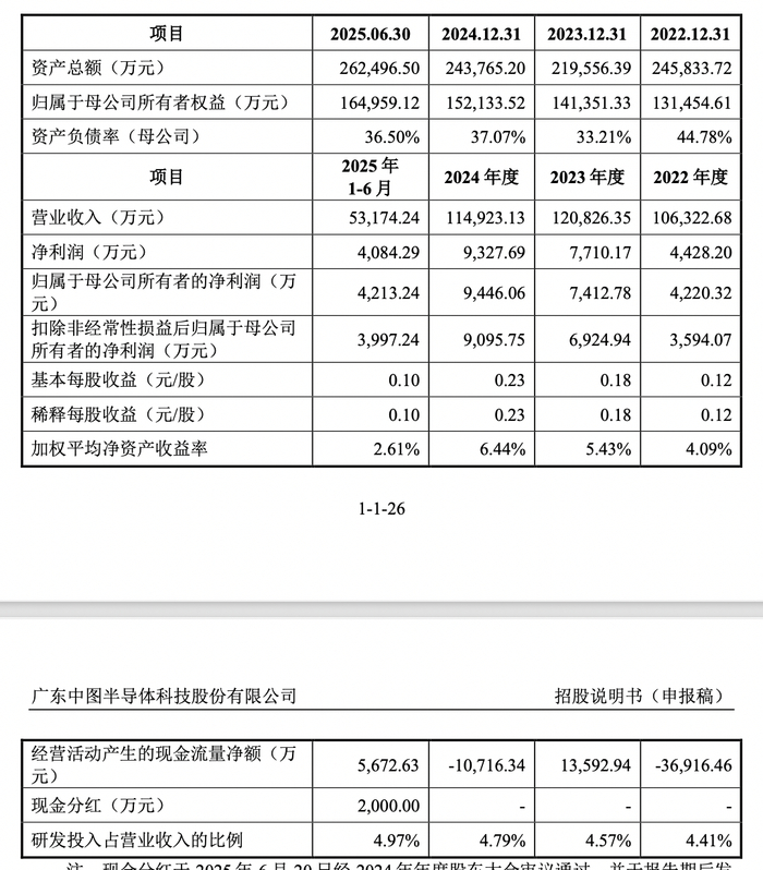 据招股书,2022年-2024年及2025上半年,中图科技实现营收分别为10.63亿元、12.08亿元、11.49亿元、5.32亿元;归母净利润分别为4220.32万元、7412.78万元、9446.06万元、4213.24万元。