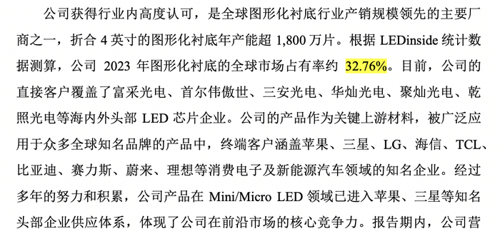 根据LEDinside统计数据测算,公司2023年图形化衬底的全球市场占有率约32.76%。