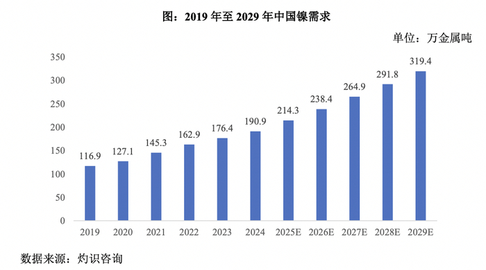 根据灼识咨询报告,中国镍需求量由2019年的116.9万金属吨增加至2024年的190.9万金属吨,期间年均复合增长率为10.3%。这一增长主要得益于新能源汽车市场的快速扩张和不锈钢消费量的持续上升。截至2024年,中国已成为全球最大的镍消费国,占全球总需求的57.1%。